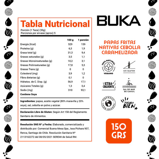 BUKA PAPAS NATIVAS 100% ARTESANALES CEBOLLA CARAMELIZADA SIN GLUTEN VEGANO 150gProveedor:BUKAPrecio habitual $1.590 CLPPrecio habitualPrecio unitario / por-