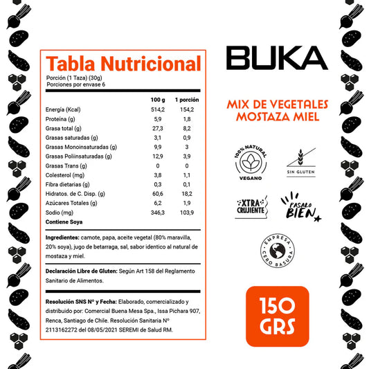 BUKA MIX VEGETALES MOSTAZA Y MIEL SIN GLUTEN VEGANO 150gProveedor:BUKAPrecio habitual $2.290 CLPPrecio habitualPrecio unitario / por