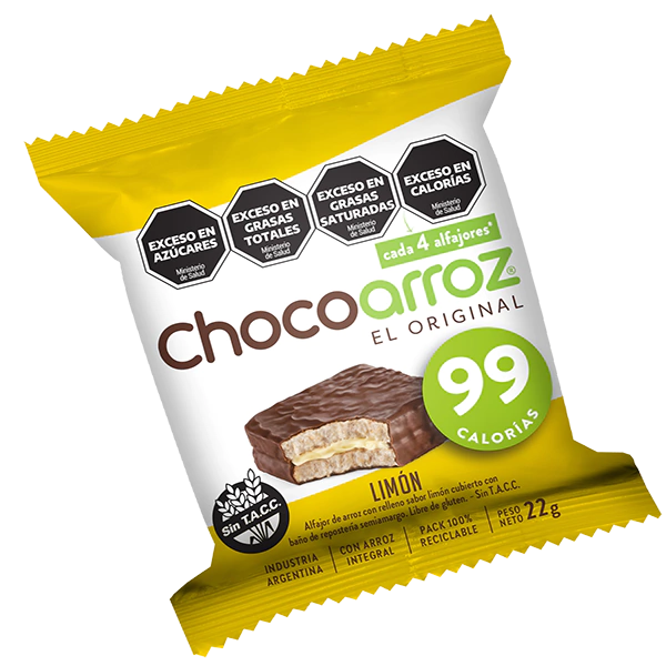 Este delicioso alfajor está relleno con sabor a limón y cubierto con un baño de repostería semimargo que complementa perfectamente su sabor. Es importante destacar que el Alfajor Negro de Arroz con limón Chocoarroz es libre de gluten y sin conservantes. Contiene leche, sulfitos y derivados de soja.