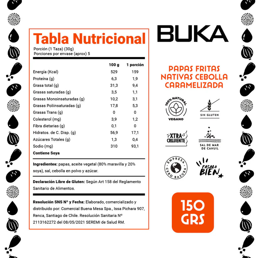 BUKA PAPAS NATIVAS 100% ARTESANALES CEBOLLA CARAMELIZADA SIN GLUTEN VEGANO 150g