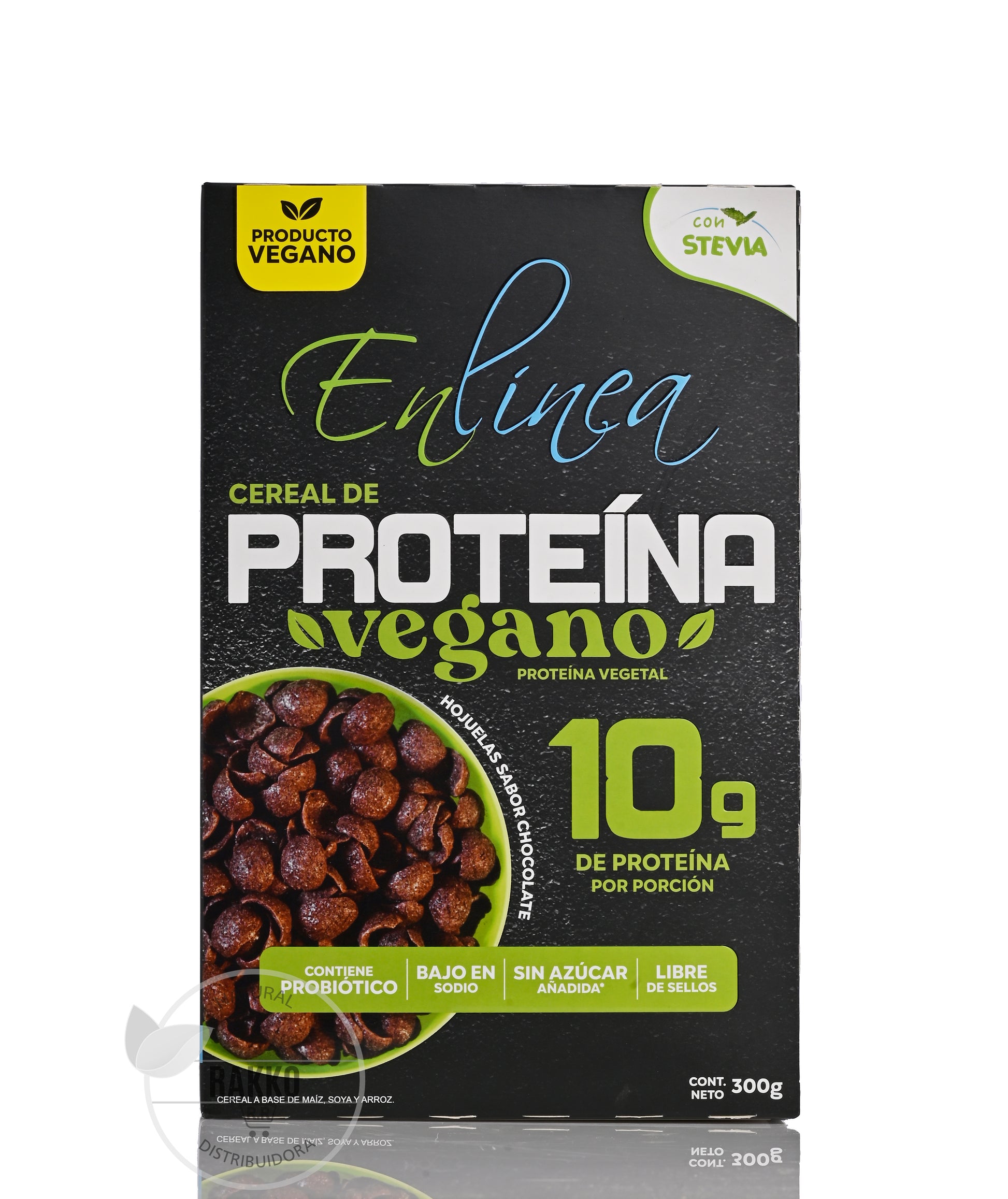 Cereal de maíz, soya y arroz en forma de hojuelas sabor chocolate con proteína vegana, endulzado con stevia y con 10 gramos de proteína por porción. Contiene prebióticos, es bajo en sodio, no contiene azúcar añadida y es libre de sellos.
