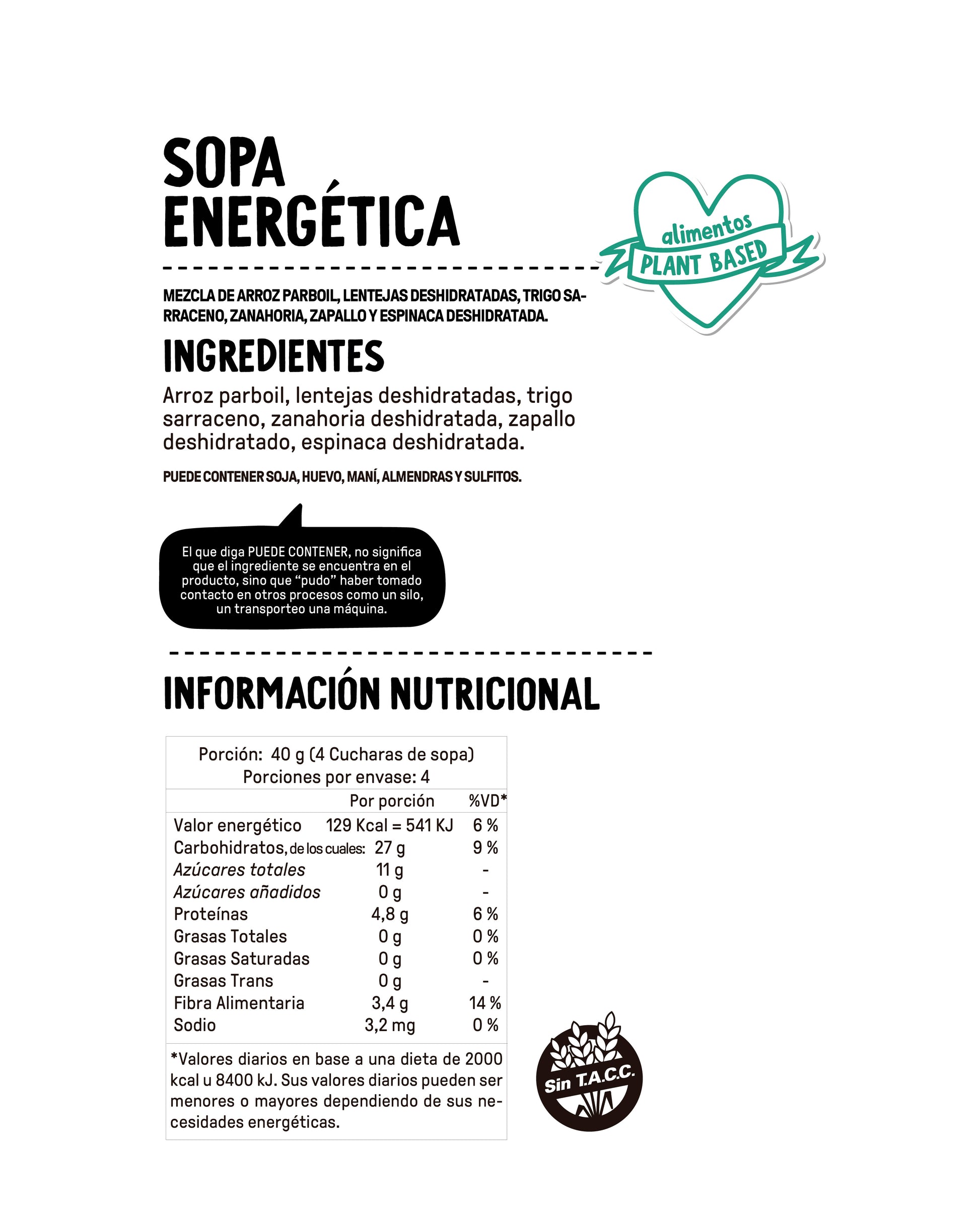 Sopa Energética vegana y libre de gluten, contiene arroz parboil, lentejas deshidratadas, trigo sarraceno, zanahoria deshidratada, zapallo deshidratado, espinaca deshidratada.
