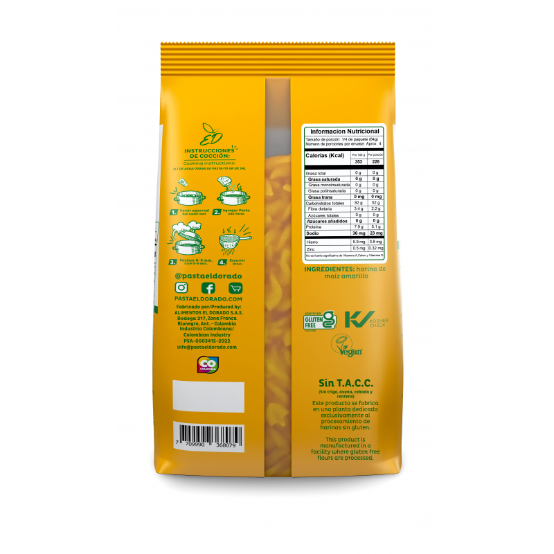 Pasta El Dorado ofrece esta presentación libre de gluten y elaborada con maíz, para que la disfrutes sin arremolinarte de culpa y con la certeza de que es baja en grasas y carbohidratos.