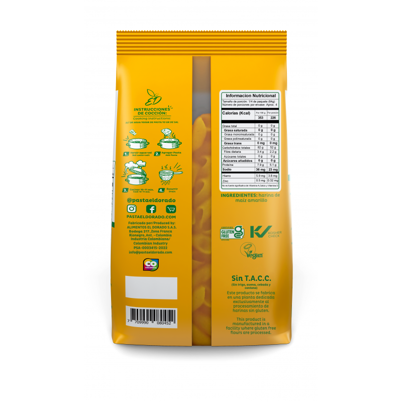 Pasta El Dorado ofrece esta presentación libre de gluten y elaborada con maíz, para que la disfrutes sin arremolinarte de culpa y con la certeza de que es baja en grasas y carbohidratos.
