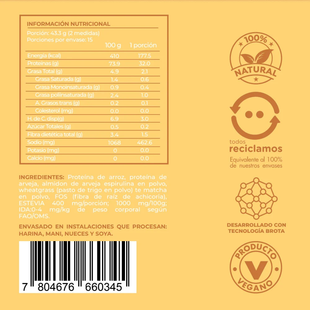 La proteína en polvo V-Pro Vanilla Force, tiene 33 g de proteína por porción y BCAA 5.8g, lo que la deja muy por sobre otras alternativas de origen vegetal y solo comparada en funcionalidad con las proteínas más avanzadas (y costosas) del mercado (ISO).