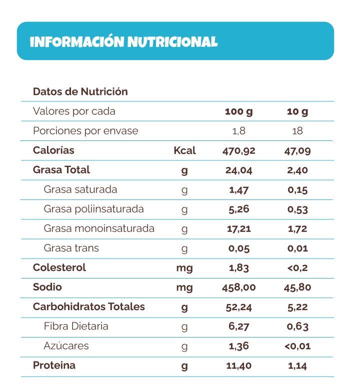 Papas fritas corte americano (Papas blancas chilenas, aceite de maravilla y sal de mar); Multicereal Wania (harina de arroz, harina de trigo, almidón de maíz, almidón de arroz, saborizante sabor queso jalapeño (Maltodextrina de maíz, queso, cebolla, glutamato monosódico, sal, saborizante idéntico natural, oleorresina pimentón); Ramitas de garbanzo Wania (Harina de garbanzo, aceite de maravilla, sal de mar, bicarbonato de sodio) y aceite de maravilla.