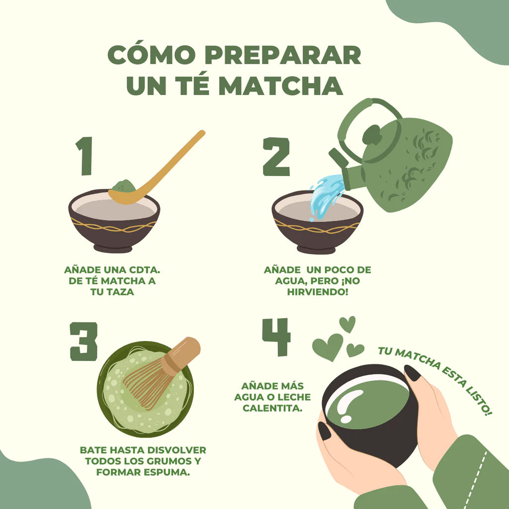 En una taza de agua con temperatura de aproximadamente 70°C puedes agregar una cucharadita (2 gr), batir y endulzar a gusto para la preparación de té matcha. También puedes agregar esta misma dosis en postres o repostería.
